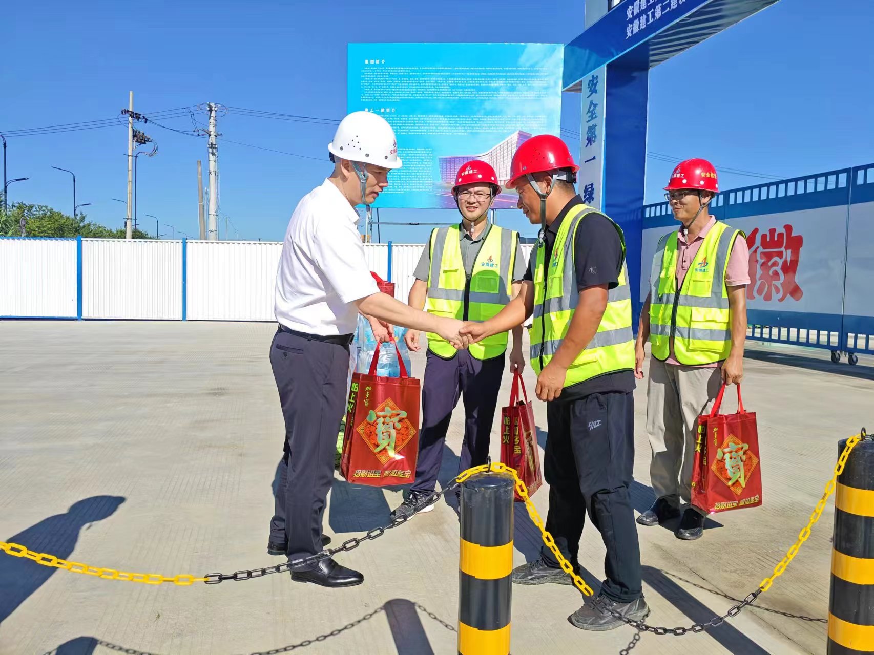 在項(xiàng)目現(xiàn)場(chǎng),朱忠明詳細(xì)了解項(xiàng)目整體建設(shè)進(jìn)度,認(rèn)真檢查項(xiàng)目安全生產(chǎn)措施落實(shí)及人員工作生活保障情況,親切看望慰問(wèn)一線建設(shè)者并送上防暑降溫用品,叮囑大家做好防暑降溫,注意勞逸結(jié)合,加強(qiáng)防護(hù),確保自身安全和健康。