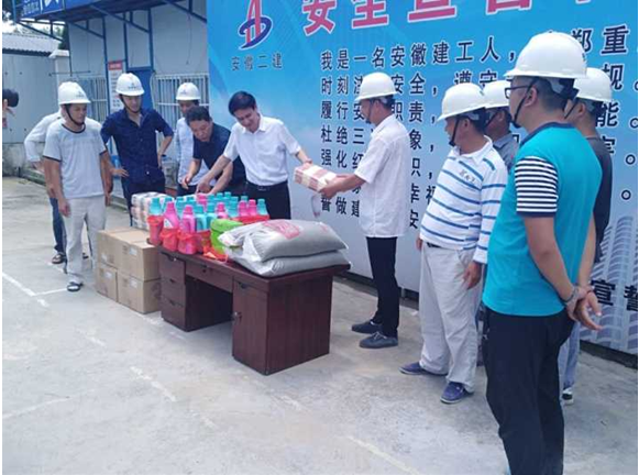 7月21日上午,驕陽似火,酷暑難當(dāng),集團公司工會副主席吳曉伍在公司工會主席李林的陪同下,不畏酷暑來到岳西潤業(yè)電商產(chǎn)業(yè)園開展“送清涼”活動,為奮戰(zhàn)在一線的員工和廣大農(nóng)民工送去了絲絲涼意,獻上了一份誠摯的關(guān)懷。項目經(jīng)理季風(fēng)帶領(lǐng)項目部全體成員迎接集團和公司領(lǐng)導(dǎo)并領(lǐng)取了集團公司為職工發(fā)放的防暑藥品、礦泉水、綠豆、毛巾、洗衣液等防暑降溫物品。