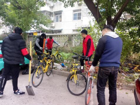 早上8點,所有參加活動的青年志愿者準時在公司大門前集合, 前往裕溪路社居委,在社區(qū)工作人員的配合下清理公司生活區(qū)綠化帶中的各類垃圾以及隱藏在綠化帶中的破舊共享單車。