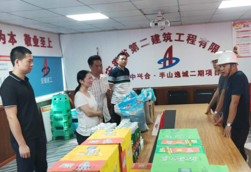 分公司支部書記倪海霞、生產(chǎn)經(jīng)理崔俊等人組成“送清涼”工作小組,頂著高溫炎熱,來(lái)到四川巴中興合半山逸城二期項(xiàng)目部,為堅(jiān)守在施工一線的勞務(wù)人員送去飲料、毛巾等各類降暑物品的同時(shí),送去了公司的關(guān)懷和溫暖。