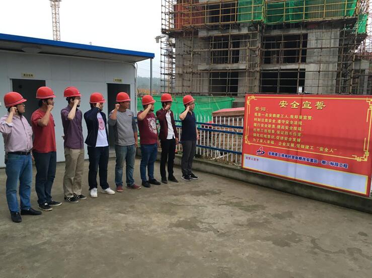 早上六點,清晨第一縷陽光剛剛灑下,項目部管理人員已在安全宣誓牌前排列整齊,面對莊嚴的宣誓牌,全體成員在項目技術負責人王歡的帶領下,右手握拳置于面龐,鄭重地齊聲宣讀誓詞:我是一名安徽建工人,我鄭重宣誓:時刻注意安全,遵守安全法規(guī);履行安全職責,提高安全技能;杜絕三違現象,保證四不傷害;強化紅線意識,促進安全發(fā)展;為了家人幸福,企業(yè)發(fā)展,誓做建工“安全人”。隨后,項目部全體成員在項目經理費祥琪的帶領下,陸續(xù)在宣誓牌上簽下了自己的名字,表明自己時刻謹記安全宣誓內容,堅持安全生產的決心。